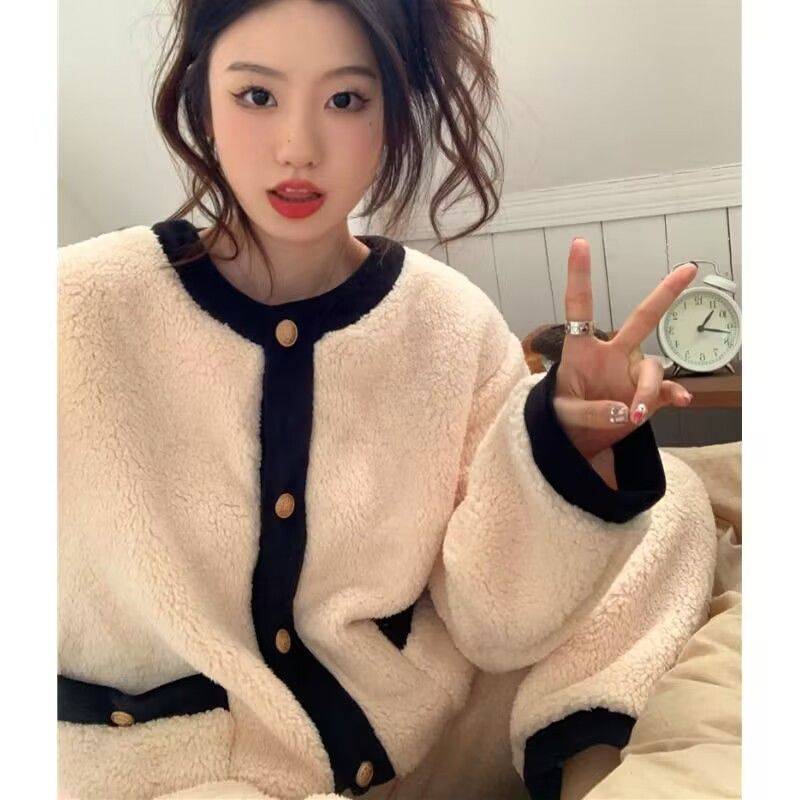 小香风加厚加绒保暖长袖长裤毛绒珊瑚绒睡衣女冬季家居服套装外穿