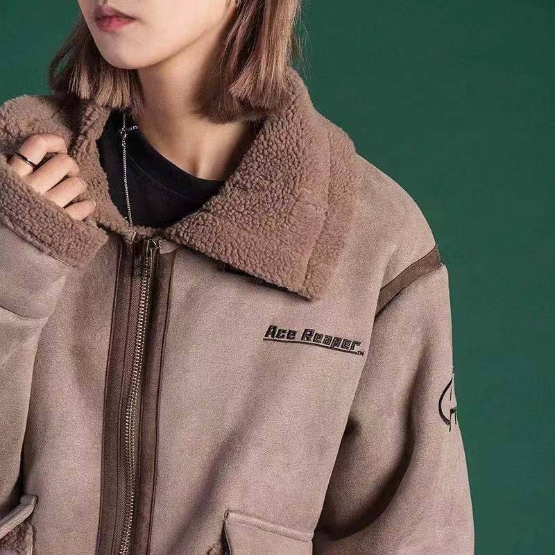 ins羊羔毛外套女短款大码秋冬季港风chic加厚羊羔绒工装机车棉服