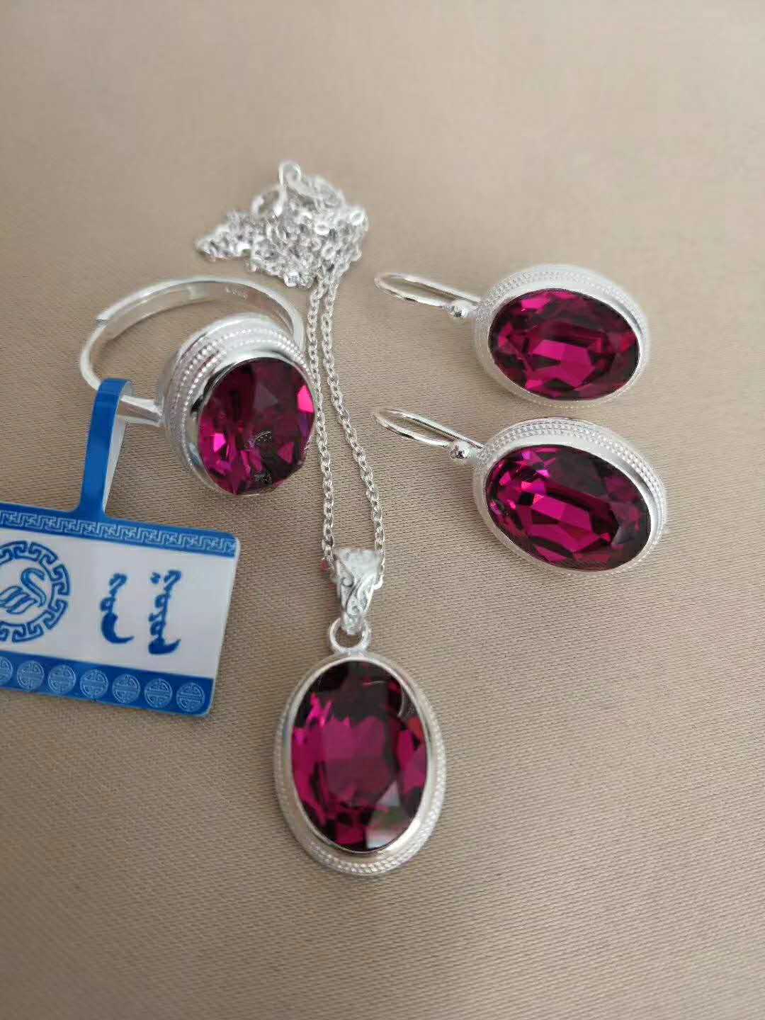 蒙古国纯银首饰套纯银镶嵌锆石套装,戒指开口