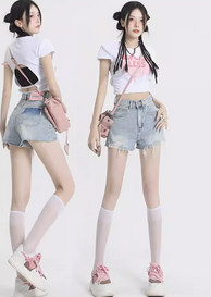 浅色破洞牛仔短裤女夏季2023新款高腰小个子辣妹撞色毛边a字热裤