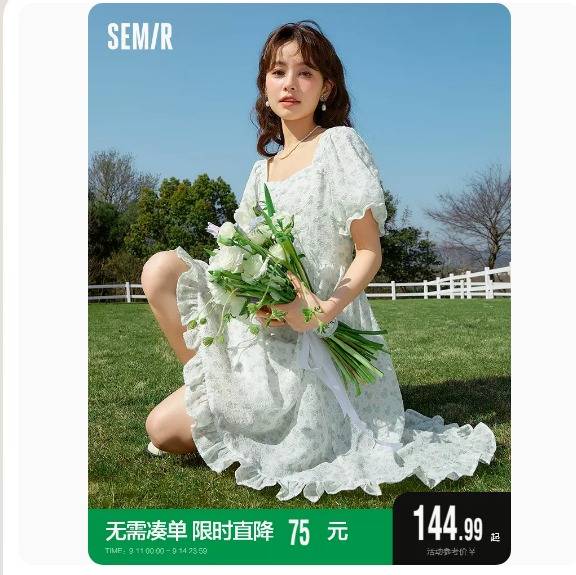 森马连衣裙女泡泡袖文艺小清新夏季2023新款女温柔肌理碎花裙森系