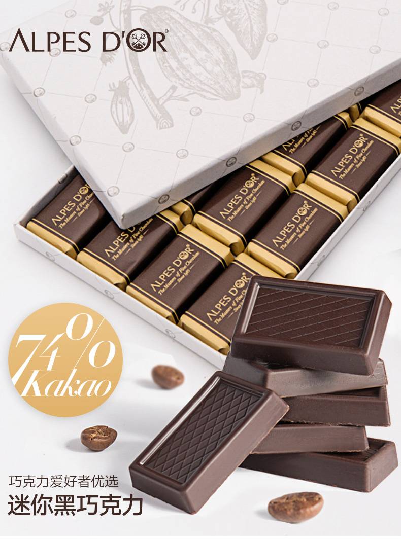 瑞士进口迷你黑巧排块可可脂苦味黑巧克力休闲分享零食106g盒装