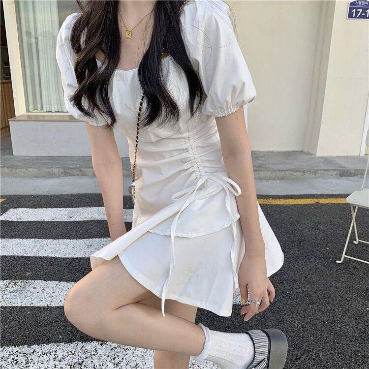 法式碎花方领连衣裙女夏2021新款抽绳设计感收腰a字裙
