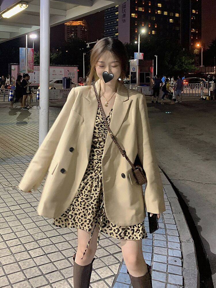 港味复古豹纹连衣裙小个子宽松外搭高端正装西服两件套