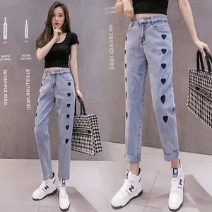 二十一晚装宽松蓝色牛仔裤黑色爱心高腰显瘦束脚ins夏季薄款