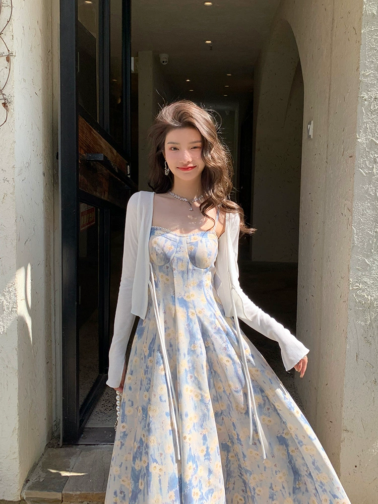 乌77小清新蓝色碎花吊带裙女甜美收腰显瘦抹胸裙子小飞袖度假长裙