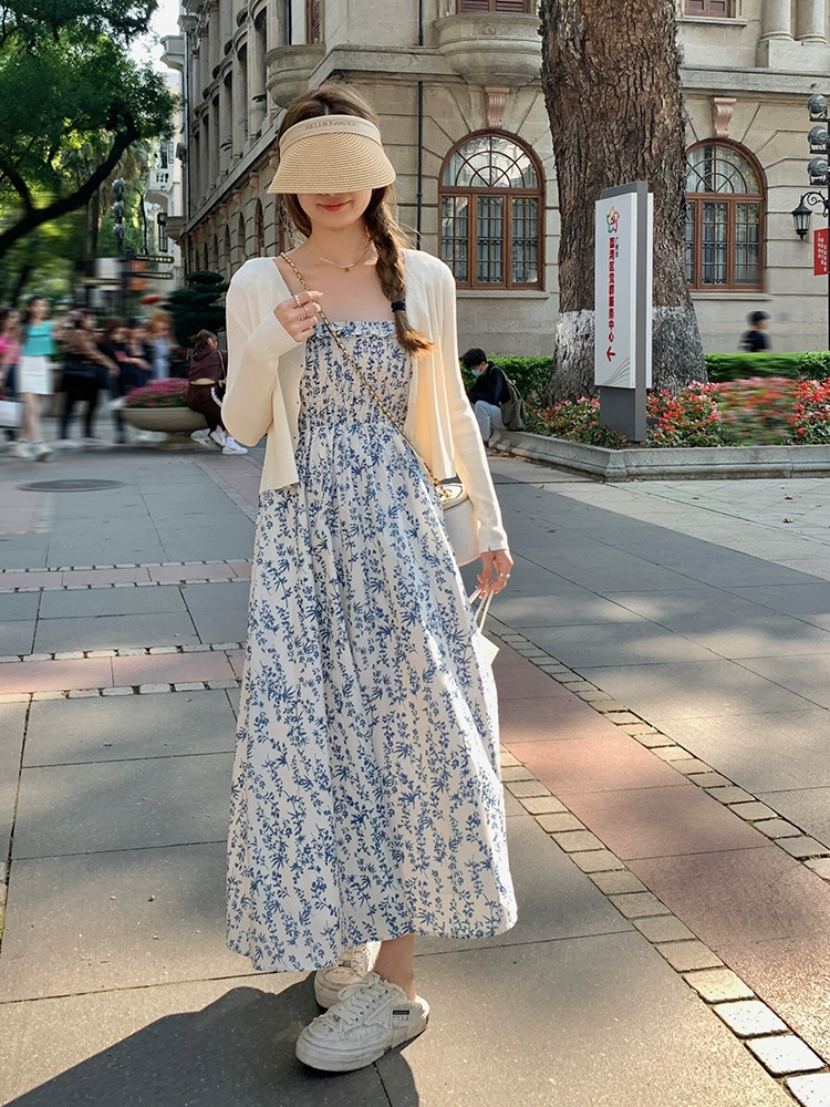 法式蓝色油画长裙沙滩裙碎花吊带连衣裙女夏仙气质感高级感