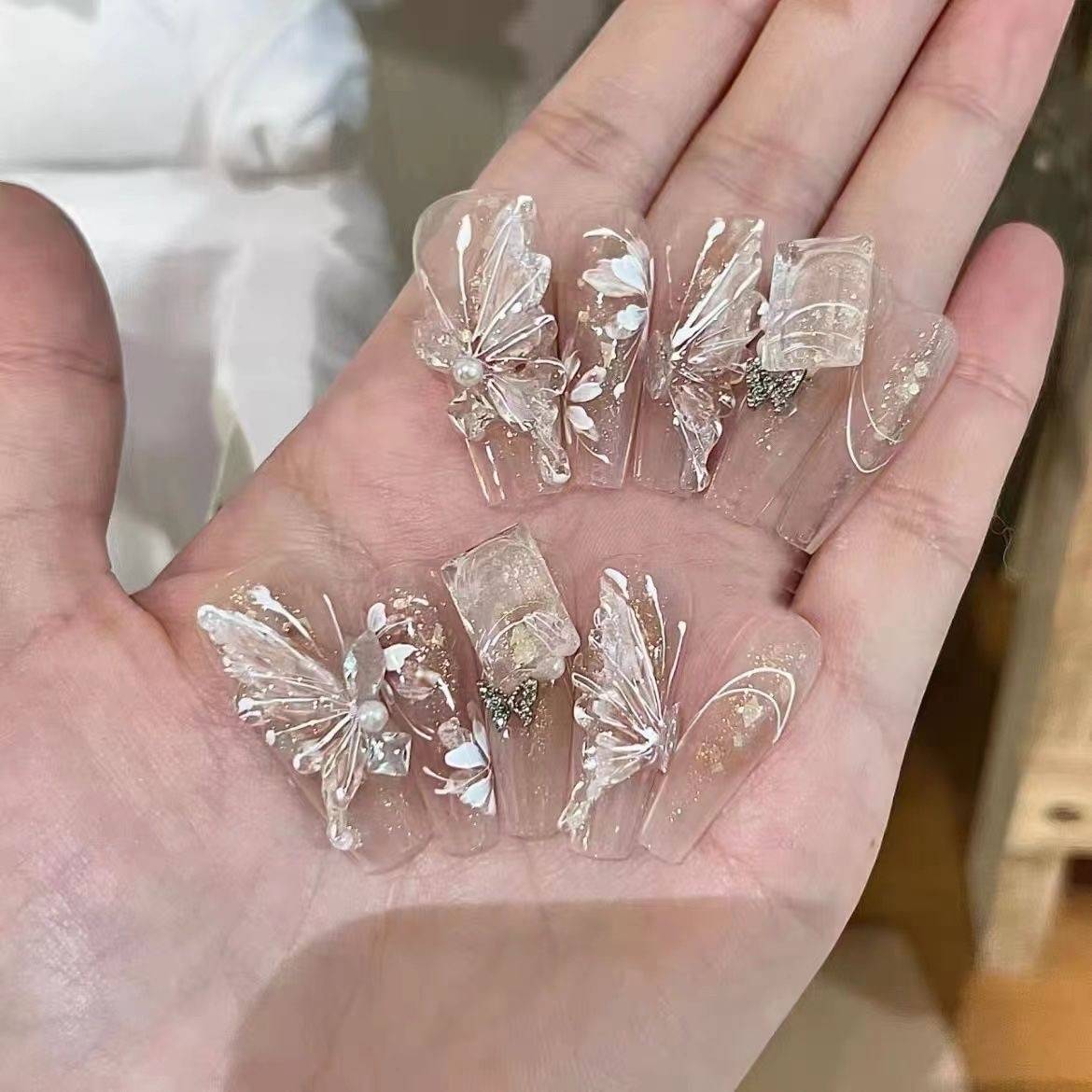 夏季光疗美甲长梯立体冰晶超仙蝴蝶奢华ins显白成品婚纱穿戴甲