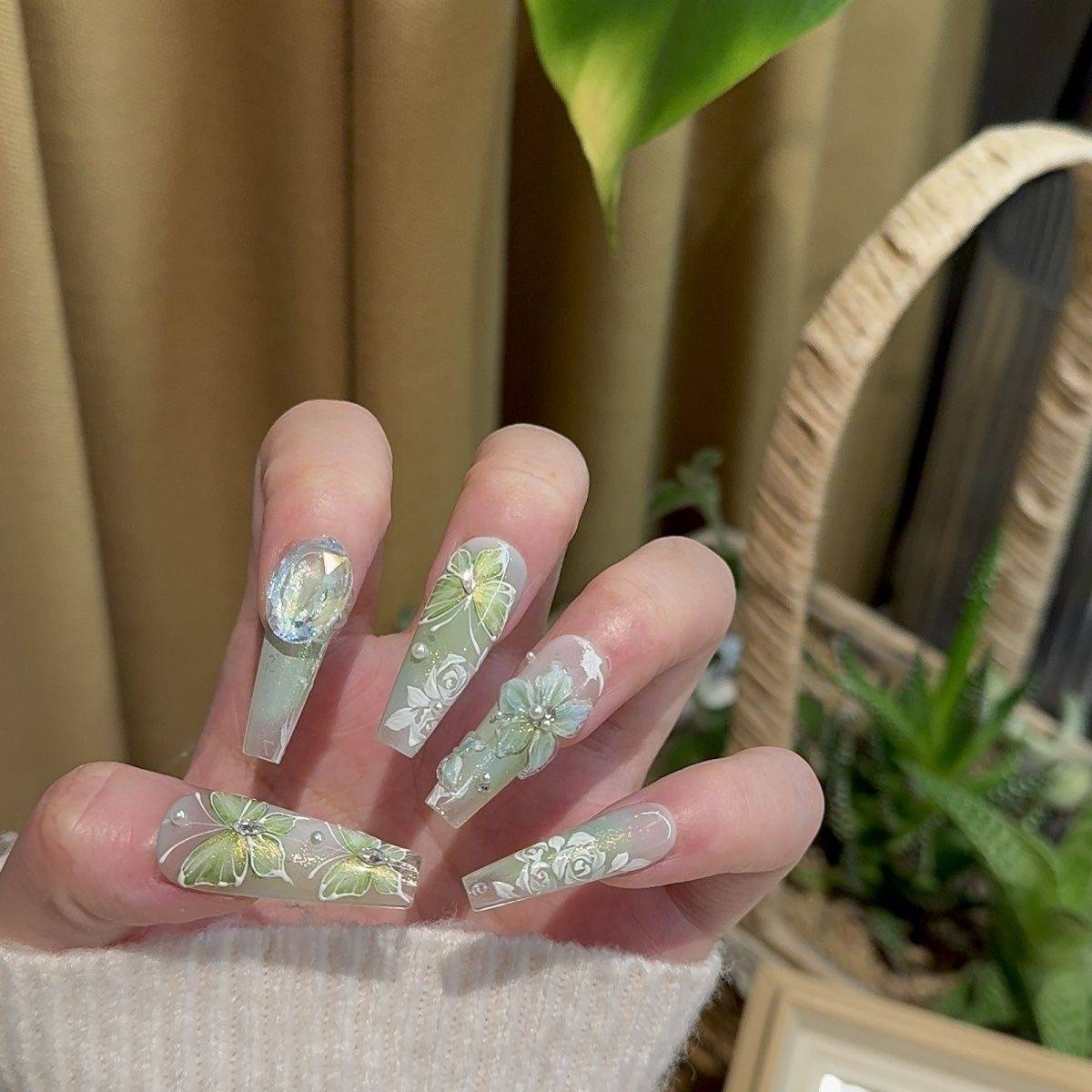 《绿茵》大地草绿蝴蝶手工雕花唯美系纯手工穿戴甲
