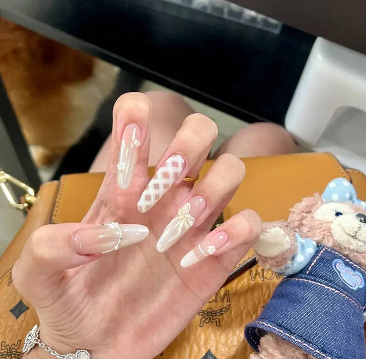 纯手工甜心少女法式珍珠粉格纹小花蝴蝶结穿戴甲温柔气质显白美甲