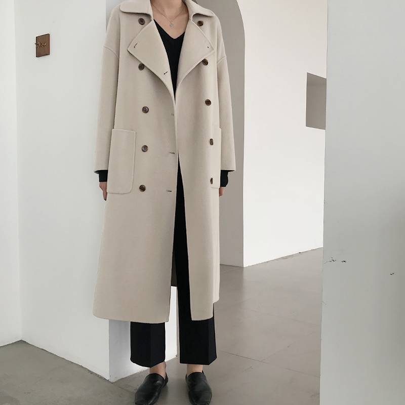 (白弓)冬季长款毛呢外套 双排扣宽松羊毛羊绒外套