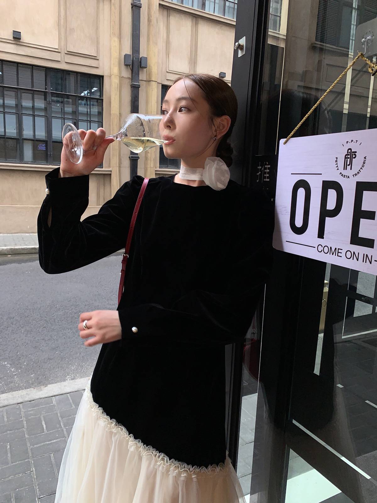 诠释美 NEWOPEN 2024秋季法式礼服网纱拼接丝绒撞色连衣裙女