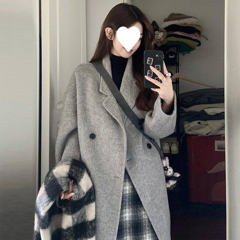 灰色西装呢子大衣女中长款秋冬韩系感毛呢外套过膝小个子冬装