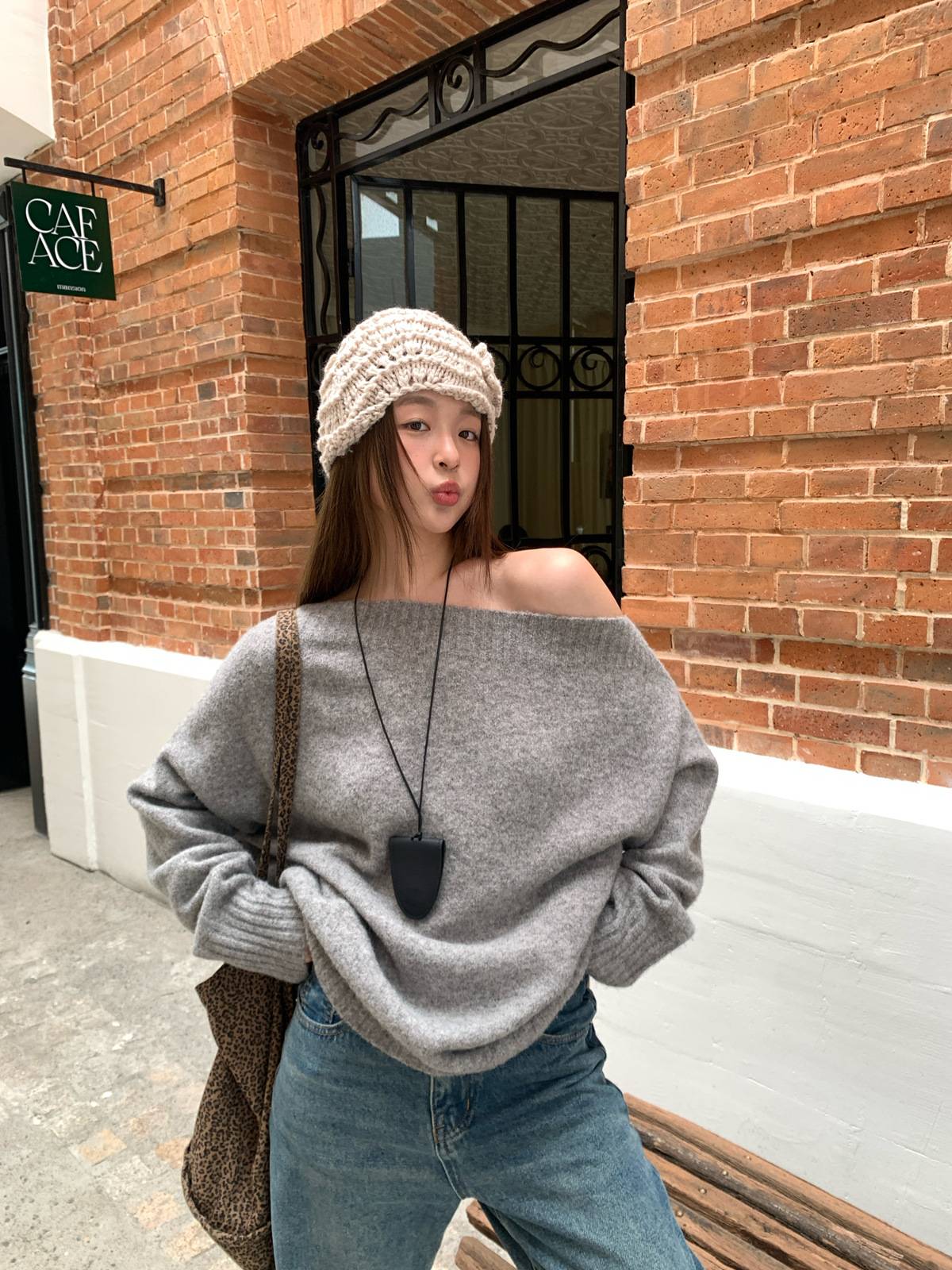 诠释美 NEWOPEN 2024秋季日韩休闲慵懒风马卡龙色斜肩毛衣女