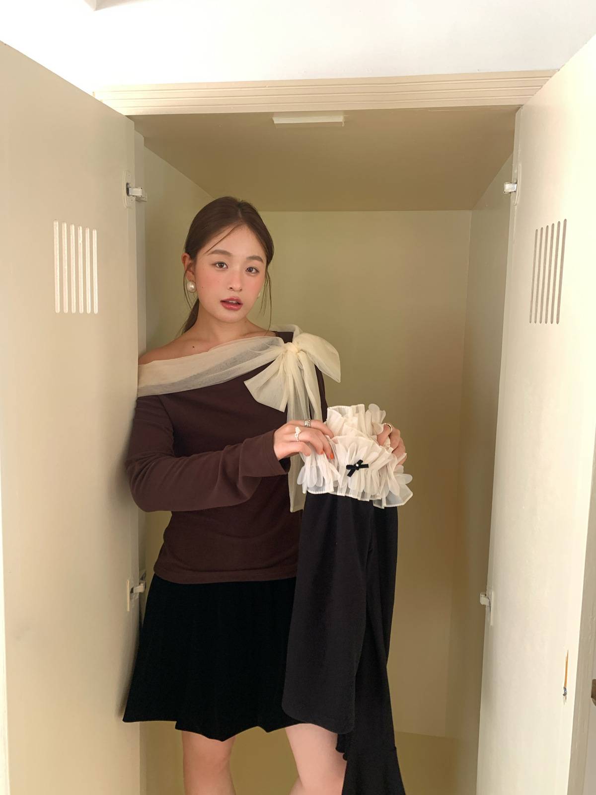 诠释美 NEWOPEN 2024秋季法式名媛纯欲绝美蝴蝶结斜肩打底衫