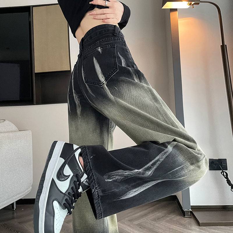 美式扎染直筒牛仔裤女秋装女装2023新款小个子显瘦高腰宽松阔腿裤