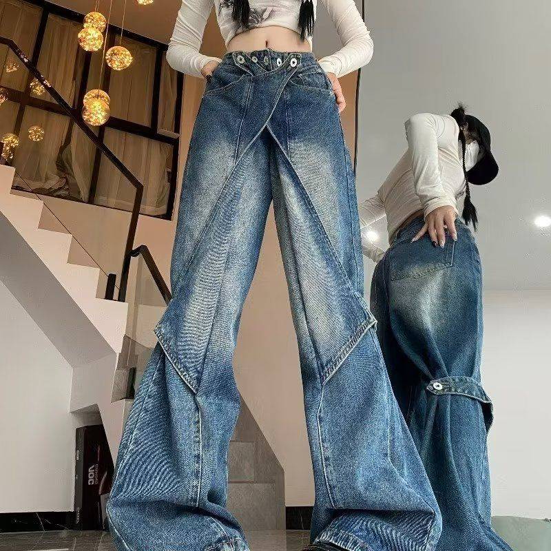 ins大码复古美式设计感拼接阔腿牛仔裤做旧宽松裤子男女