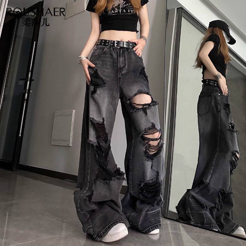 ROSEL韩版ins高街小众帅气个性破洞显瘦牛仔裤磨白宽松裤子潮流女