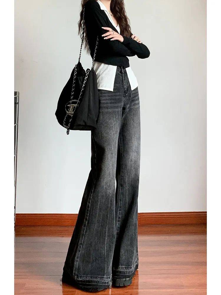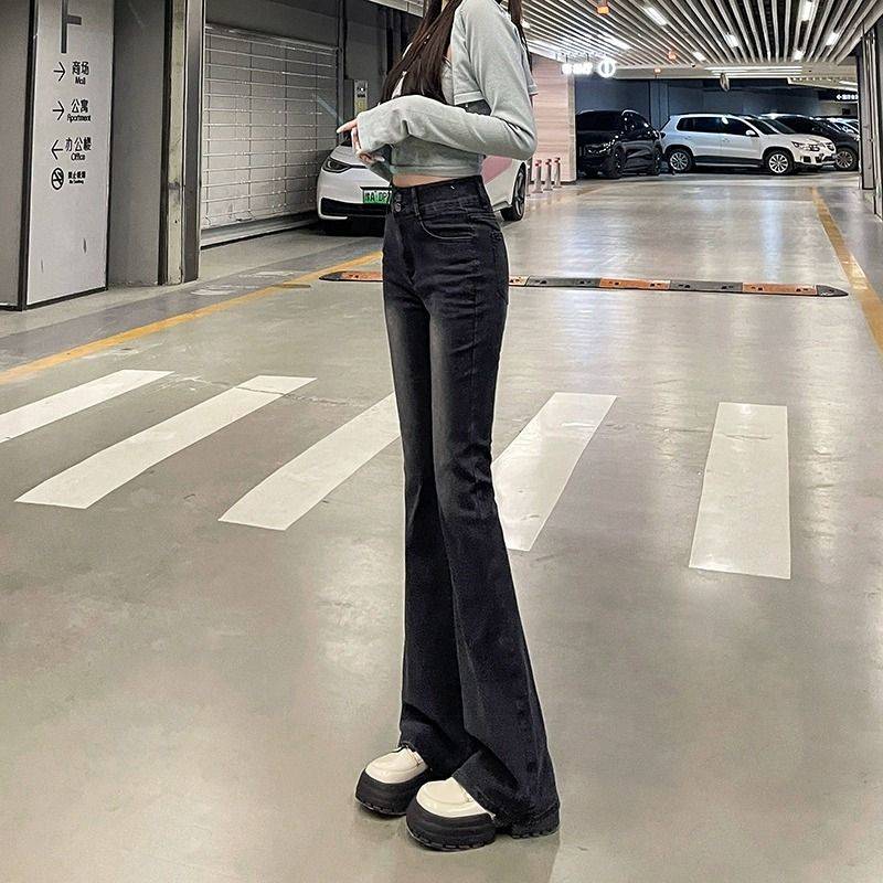 黑灰色高腰微喇叭牛仔裤女2023春秋新款加长弹力修身显瘦马蹄裤子