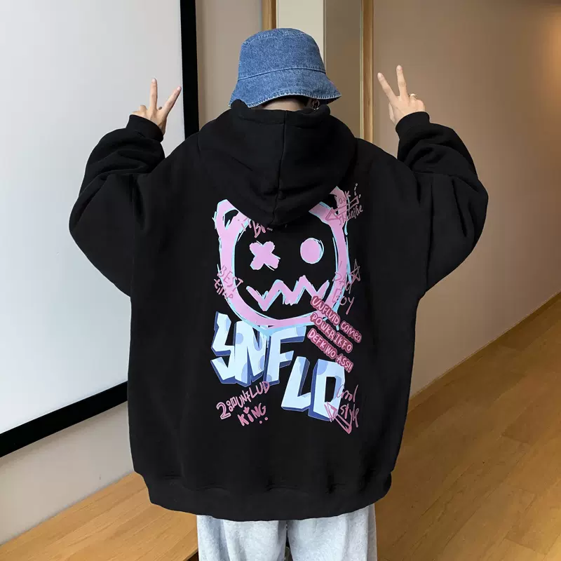 100%纯棉男士连帽卫衣新款港风潮流宽松百搭小众hiphop情侣外套