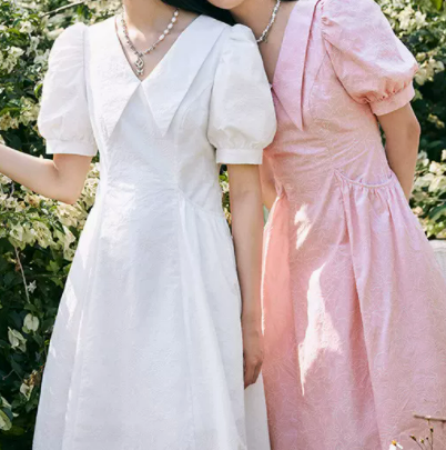 太平鸟粉色赫本风连衣裙白桃气泡水2022夏季新款收腰温柔气质长裙