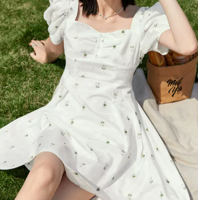 太平鸟法式方领碎花连衣裙月野少女2022夏季新款收腰气质甜美裙子
