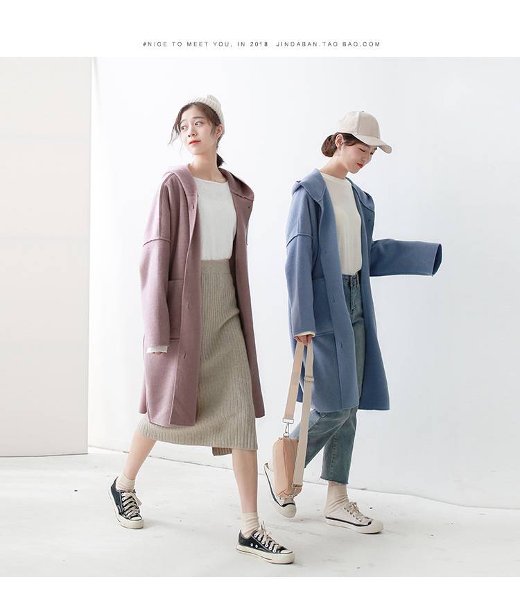 2018秋冬季新款森系连帽中长款双面毛呢子大衣外套女厚