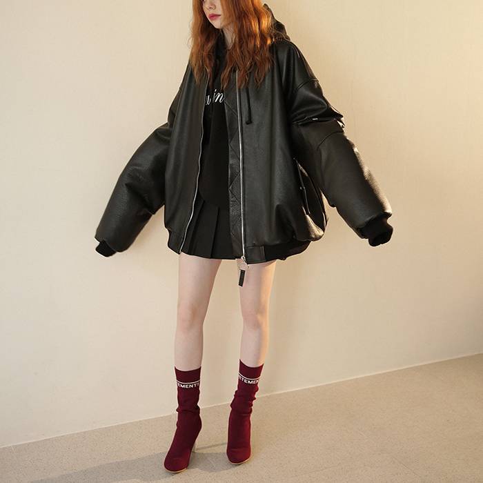 秋冬2018新款女pu皮帅气飞行员夹克oversize棉衣女夹棉外套情侣装