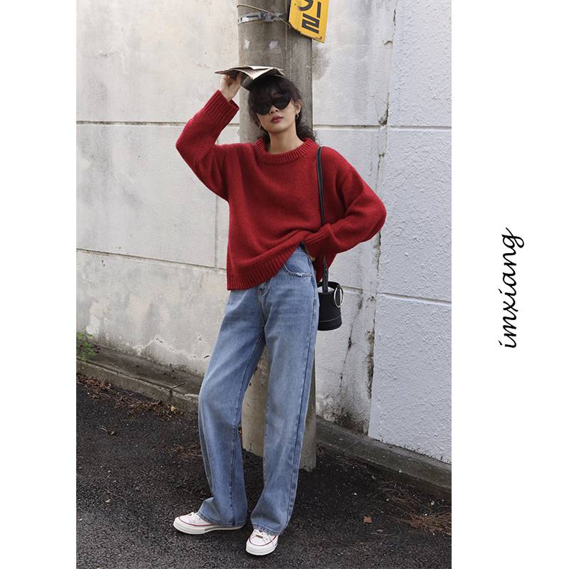 秋冬圆领长袖套头宽松马海毛毛衣女
