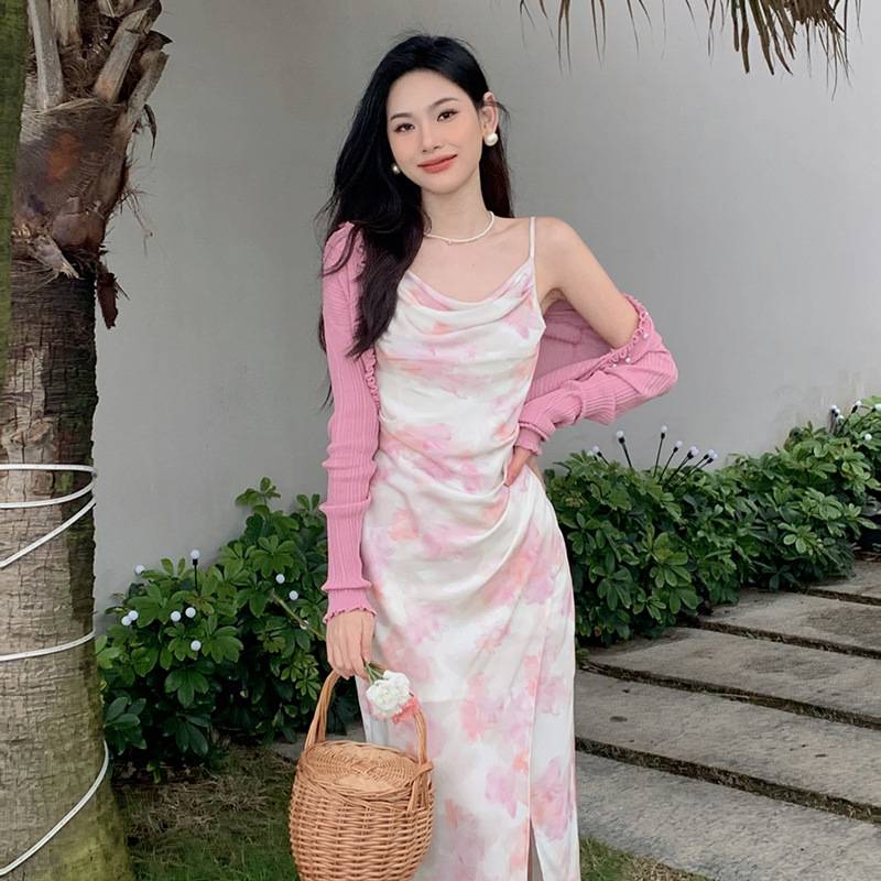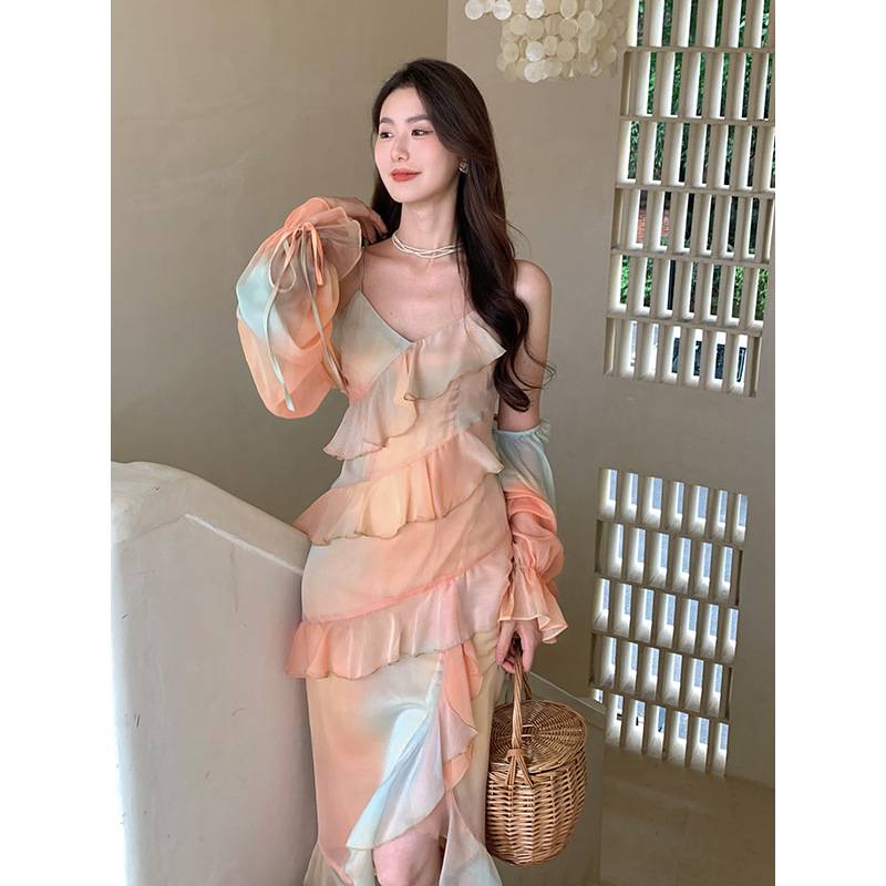 2023夏季新款韩版渐变色防晒披肩高腰吊带连衣裙子套装