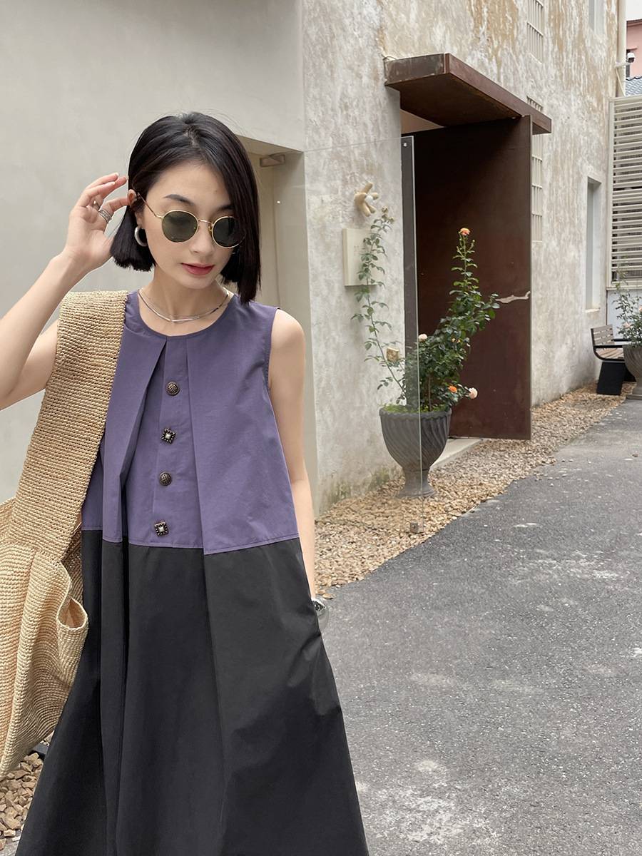 2023夏季新款裙子百搭撞色拼接设计圆领a字连衣裙女