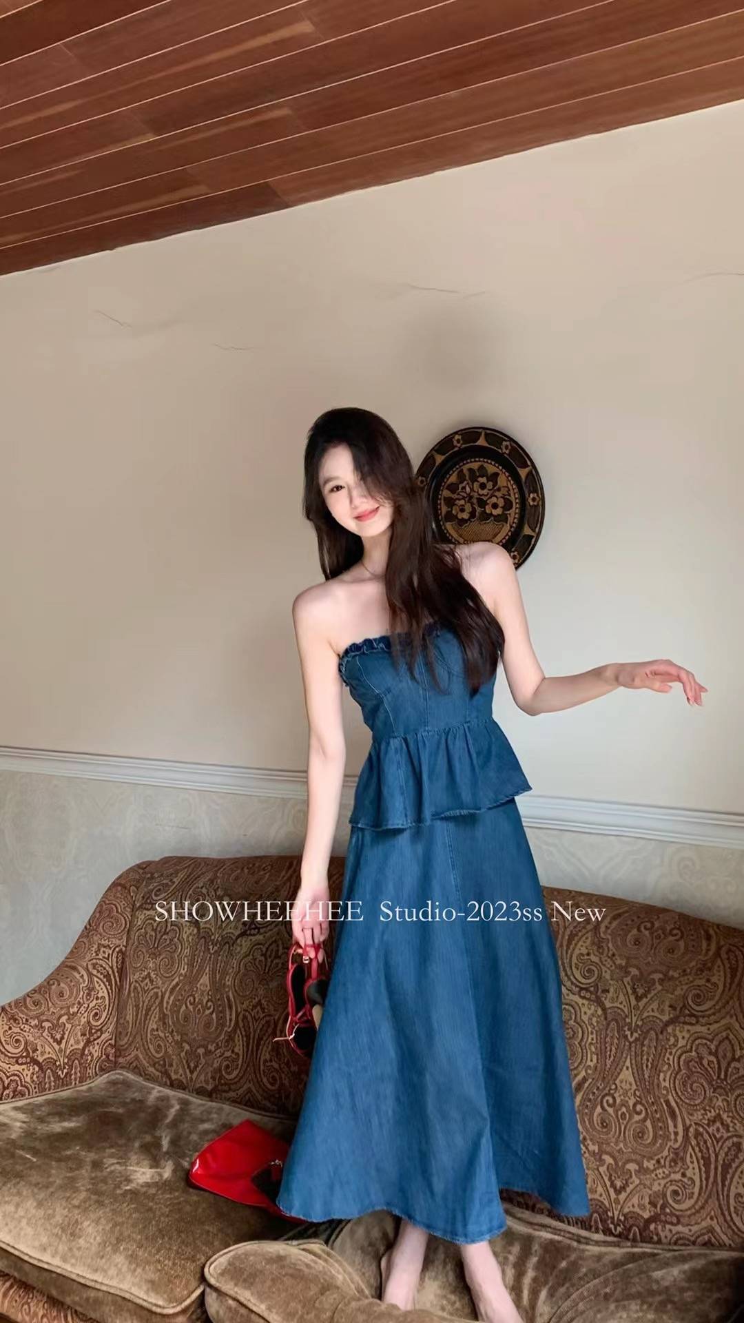 法式复古牛仔抹胸上衣女高腰牛仔水洗半身裙子两件套装