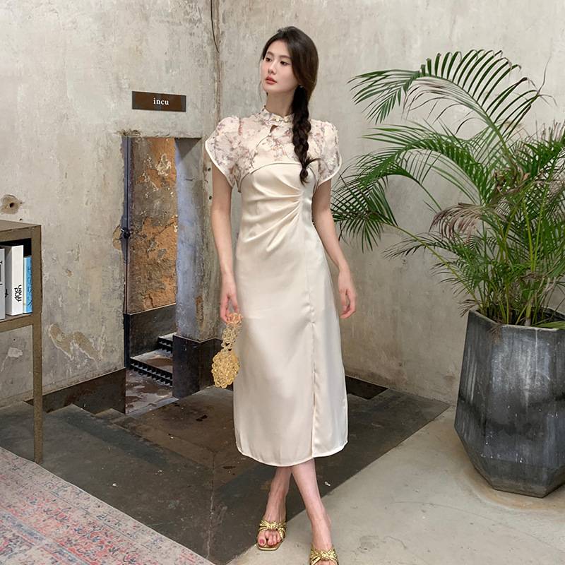 2023夏季新款法式气质高腰印花缎面吊带连衣裙长裙子女