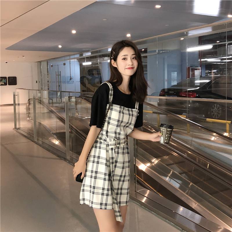 2019陆小姐的店春夏新款假两件格子背带裤