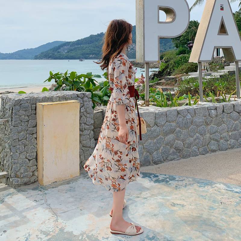 超爆款系带收腰连衣裙显瘦雪纺碎花裙仙女裙
