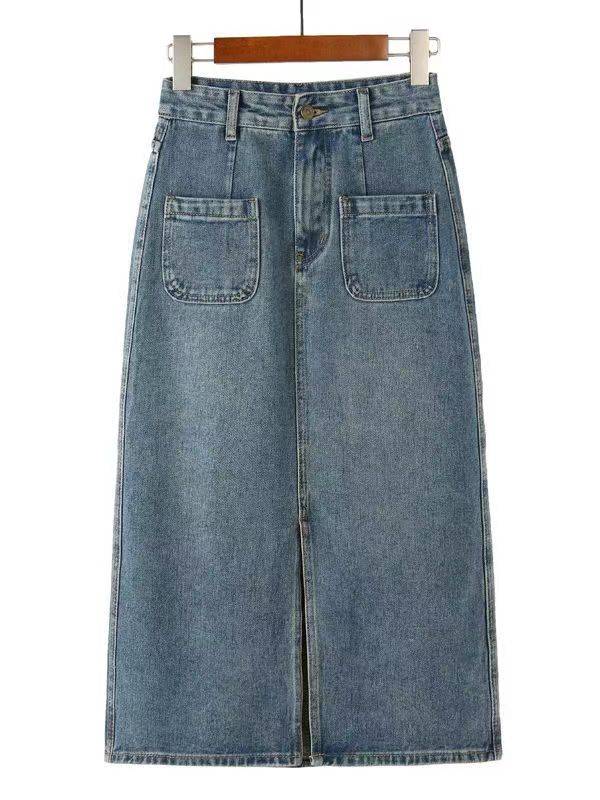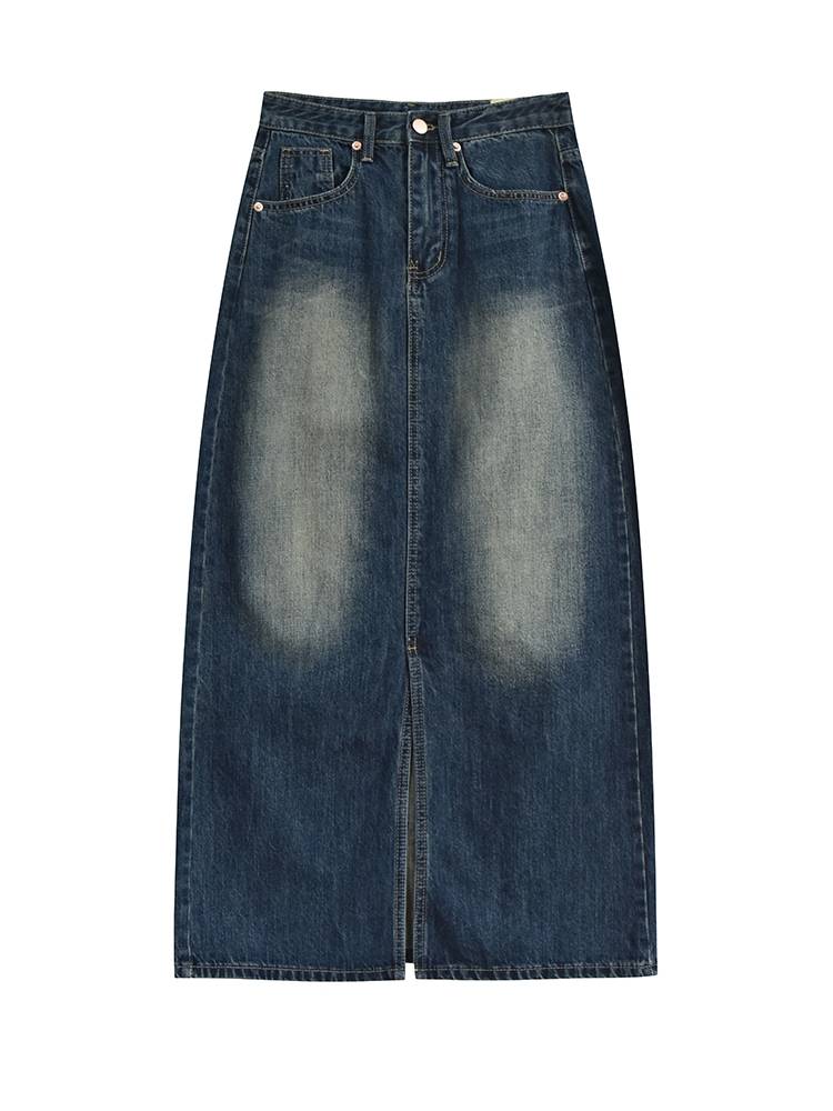 花田橱窗 复古磨白牛仔半身裙女秋冬港味高腰显瘦开叉a字直筒长裙