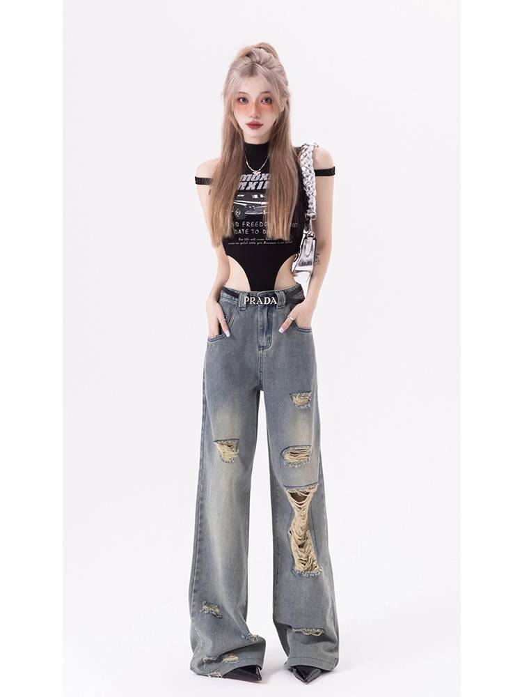 莫欣欣 破洞阔腿牛仔裤女2022年新款直筒宽松裤子美式高街ins潮