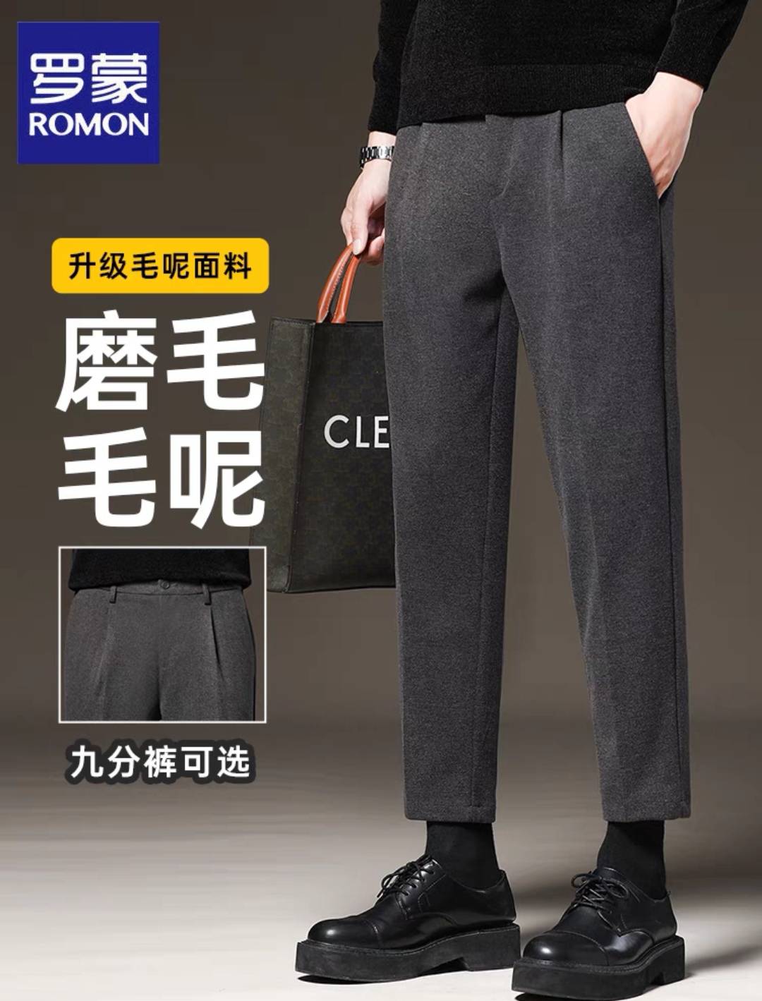 罗蒙春秋季毛呢裤子男士修身长裤韩版休闲直筒加绒垂感九分小西裤