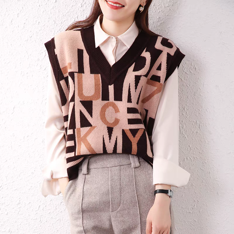 春秋新款宽松字母羊绒马甲女纯羊毛背心慵懒风V领100%纯羊绒毛衣