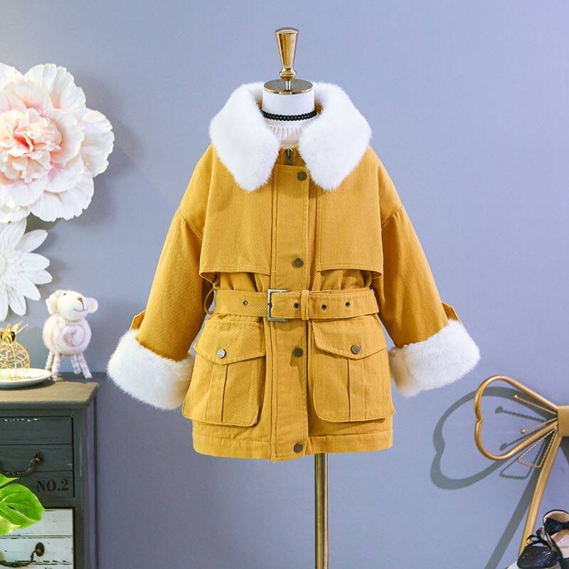 品牌童装2018冬季新品女童韩版中长收腰毛领工装大衣儿童加厚外套
