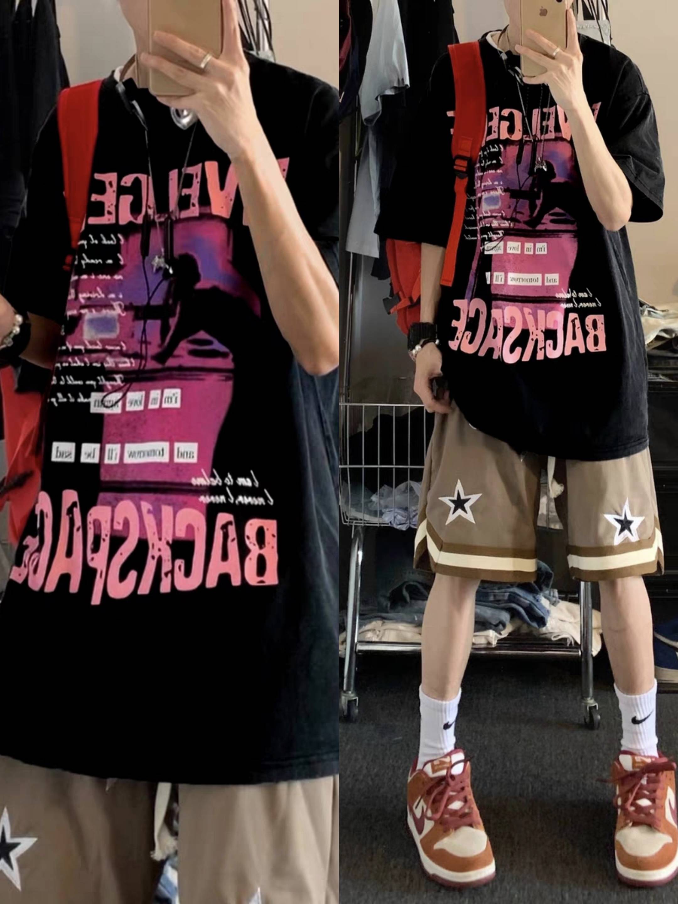 欧美街头潮牌t恤小领口300g重磅美式复古短袖男高街hiphop七分袖