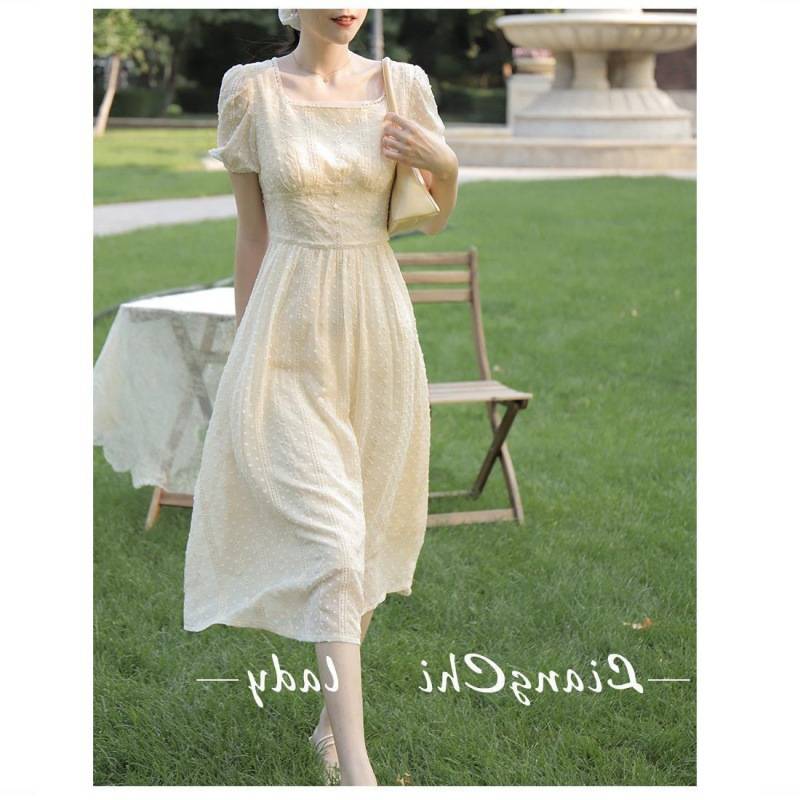 网红 2023新款微醺甜茶 气质法式方领新款温柔仙女风长款连衣裙