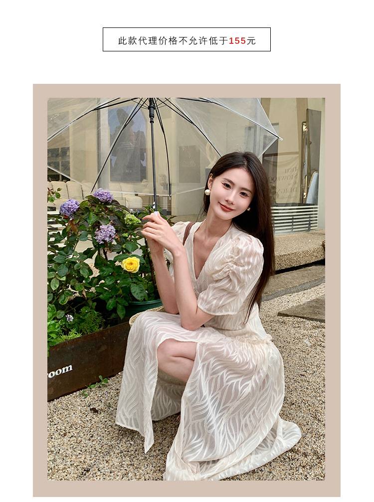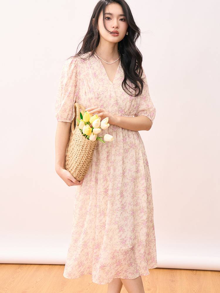 23夏新法式复古浪漫风v领印花泡泡袖高腰系带飘逸连衣裙
