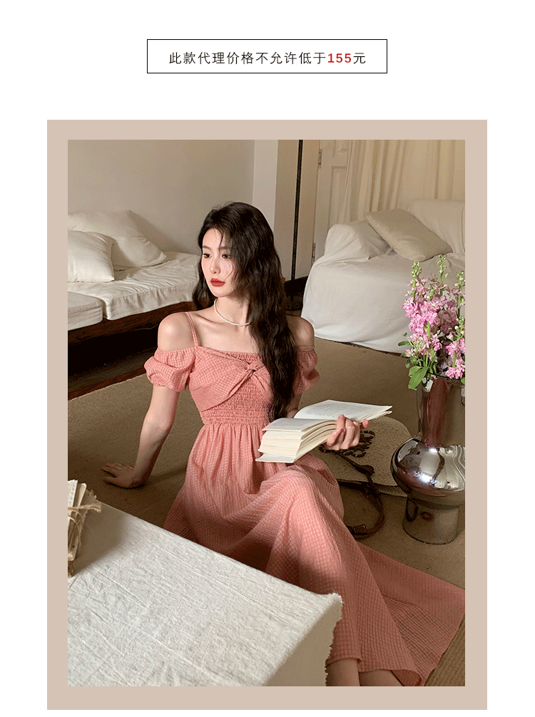 秀熙熙2023夏季新款纯色遮肉显瘦气质高腰短袖吊带连衣裙子女8289