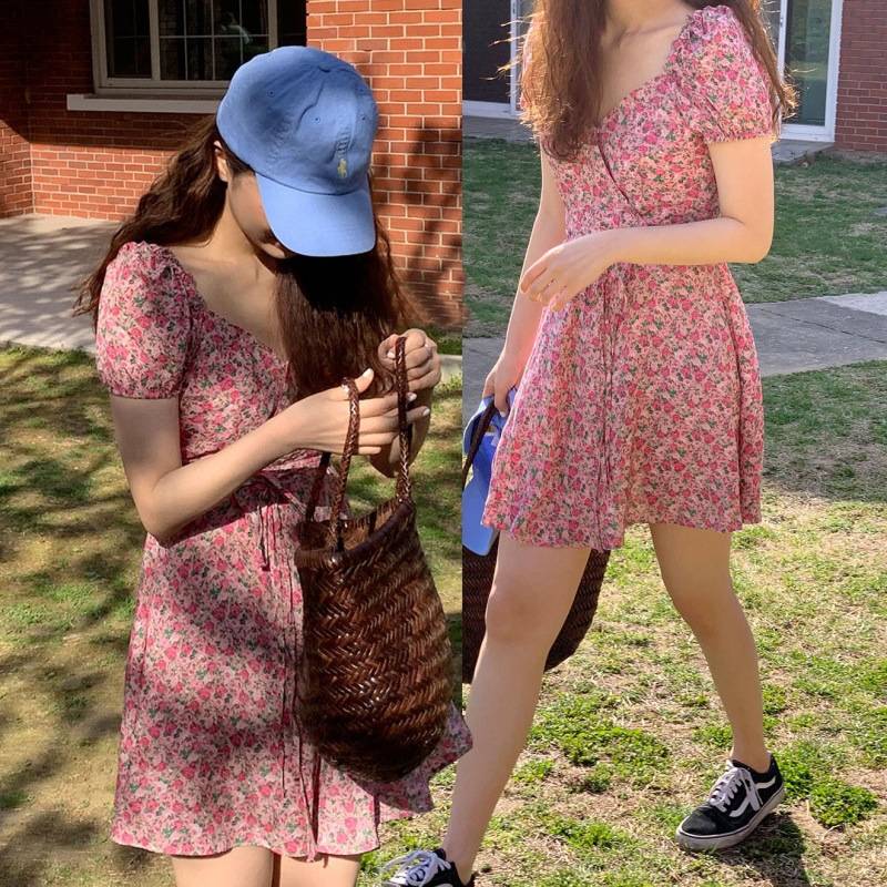 【现货】韩东大门夏季雪纺V领泡泡袖中款印花连衣裙女v