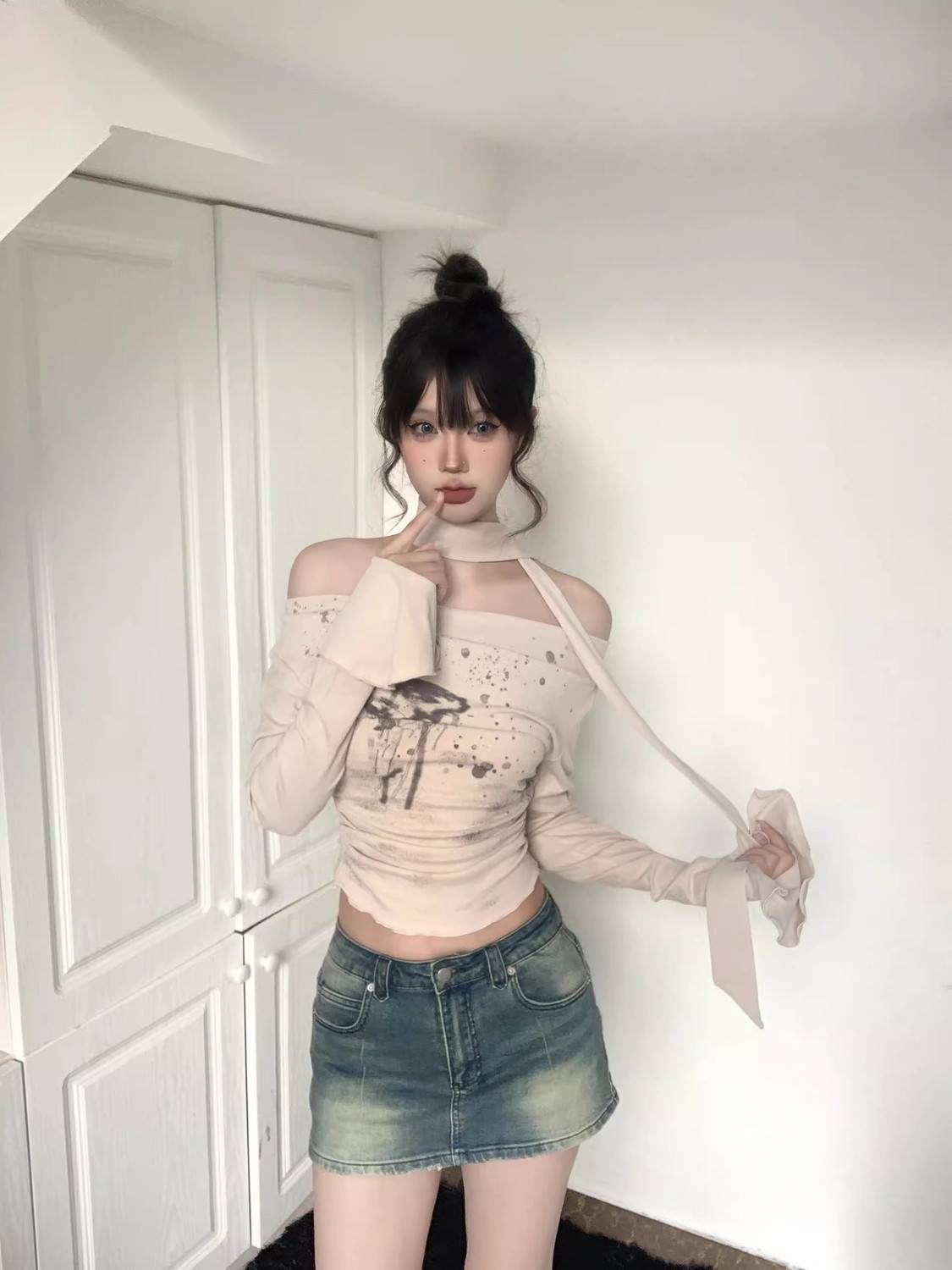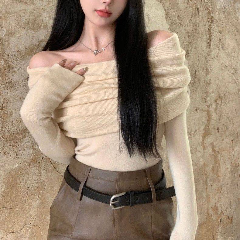 基础款正肩纯棉短袖T恤夏季修身显瘦百搭气质休闲上衣纯欲小心ji一字肩针织打底衫女秋冬季加厚毛衣设计感长袖别致上衣美拉德一