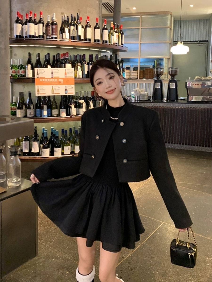 富家千金小黑裙立领短外套女秋冬2023新款气质短款开衫双排扣上衣