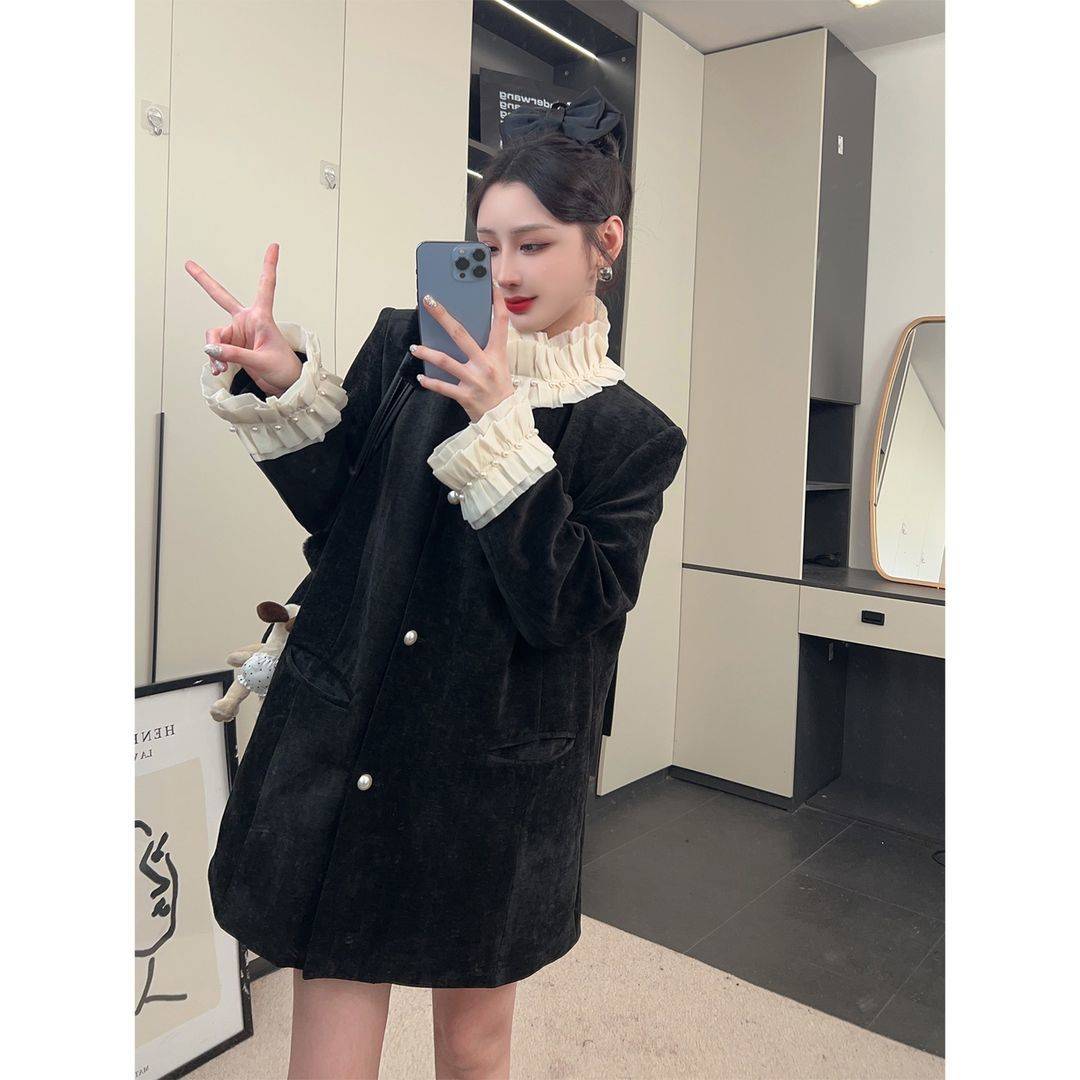 黑色英伦小香羽绒内胆中长款外套2023年冬季新款珍珠花边连衣裙潮
