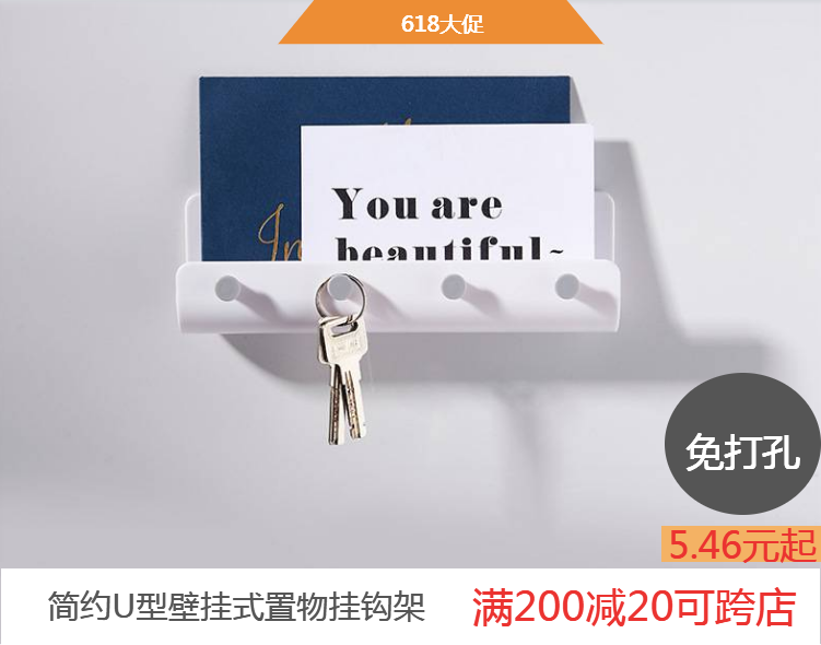 简约U型壁挂式置物挂钩架免钉带4挂钩收纳架居家创意多用钥匙挂钩