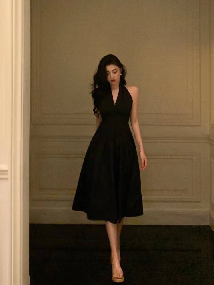 黑色性感挂脖连衣裙女夏季海边度假露背无袖气质收腰小黑裙